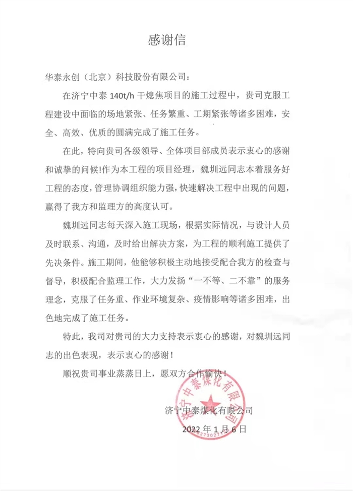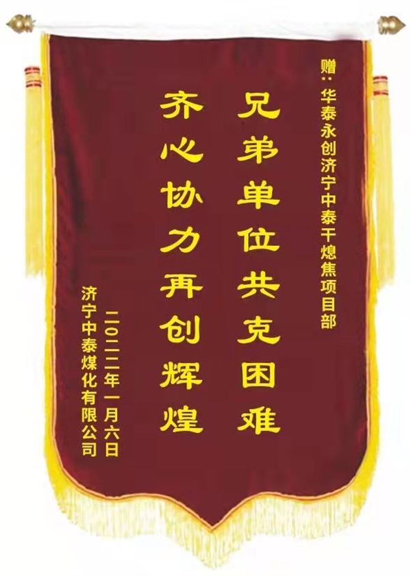 近日,我们收到了来自济宁中泰煤化有限公司的感谢信和锦旗!